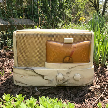 The Emerson 'Moderne' was offered in a variety of materials, including bakelite, wood, and beetle plastic, which this example is made from. Frequently the dial warps to the point of self-destruction.