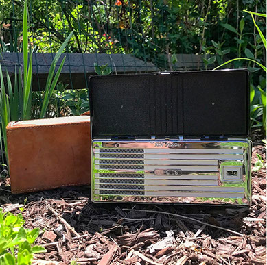 This was the second camera-style portable radio after the Sonora Candid, and sold over 200,000 copies in two years. These were meant to be personal radios, and buyers could customize them by putting their initials on the speaker grill. Most have a blank spot there, but this one says 'WCS'. It also has the optional leather carrying case.
