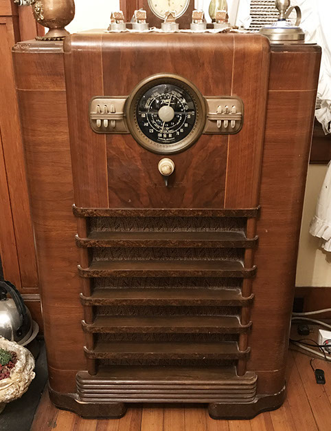 The 10S464 was one of Zenith's most popular radios for 1940. It features a large black dial, green tuning indicator, 'radiorgan' tone controls, pushbuttons, 3 bands and push-pull audio output. The tuning knob is weighted, and the chassis is mounted on springs. Overall performance was very good, and with the popular streamline modern styling, there's no wonder why it was such a sales success. This model was one of the first to use some photofinish (the front of the grill bars). In general, mine is in very good condition, but often these radios are found with the photofinish completely worn off.